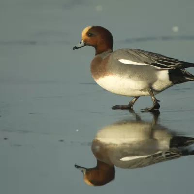 Smaller than a mallard, with a short neck and small, blue, black-tipped bill. They have a round, chestnut head with a creamy-yellow patch on the forehead. The body is mostly grey, with a white belly, pinkish breast and black rear. The speculum is green with a large white patch in front of it. Often gives a whistling call.