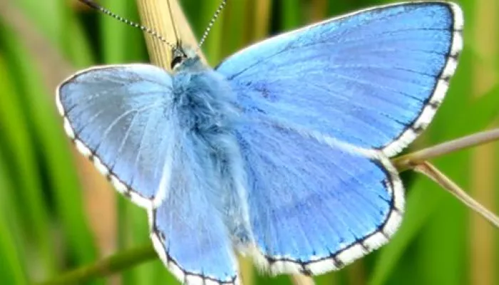 But the most spectacular of all were the four Adonis Blues seen basking on grassland alongside the footpath, providing excellent views for all those present. These beautiful turquoise blue butterflies with black and white chequered wing margins are rare in the UK, confined to chalk grassland in Southern England. This is why they were chosen as the logo of Kent Wildlife Trust, and were clearly identifiable to all from Lizzie’s polo shirt!