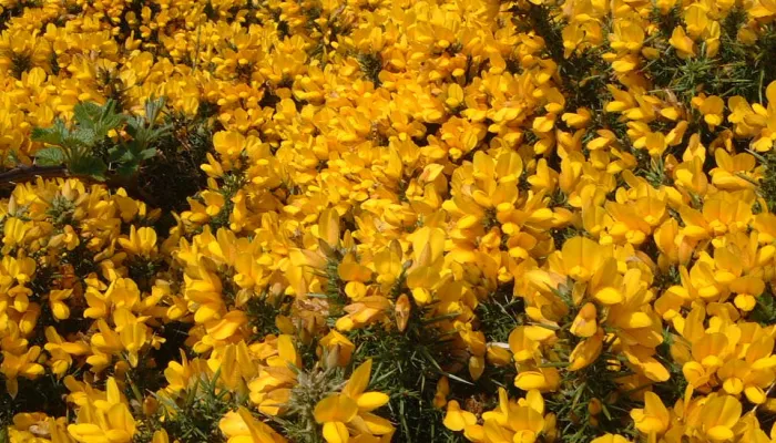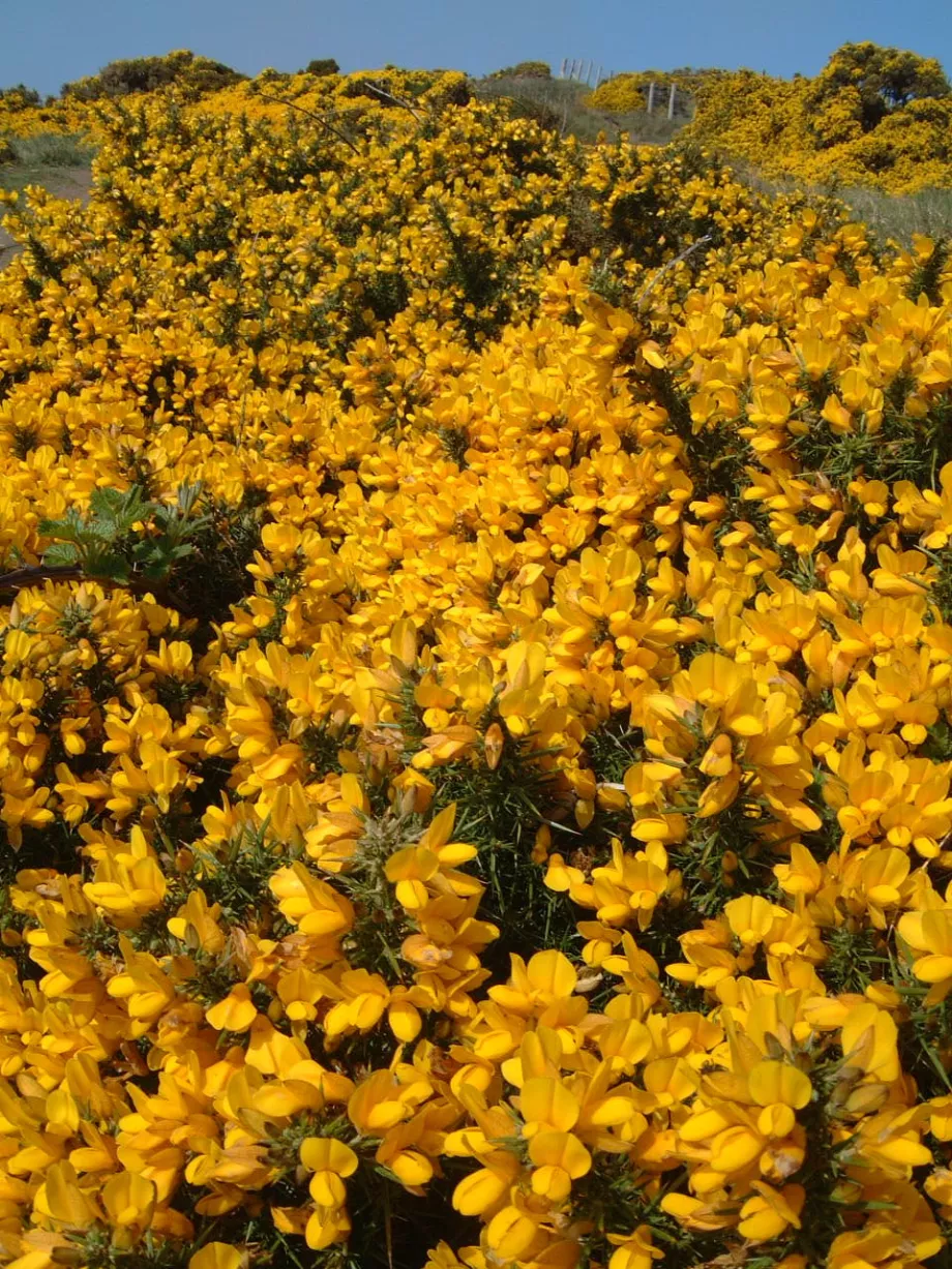The gorse now in bloom is Ulex europaeus, common gorse. The dense, intensely spiky shrub provides essential perches and nesting cover for birds and year-long shelter for animals and insects. The coconut-scented flowers that open in any mild spell through winter into spring are an important source of nectar and pollen for insects.