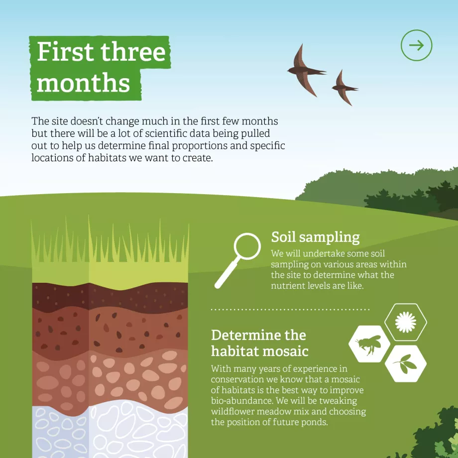 The first year is all about establishing the site and getting it sowing the metaphorical (and sometimes literal) seeds that will set the site up for continued growth. We would begin planting hedgerows, secondary woodland and scrub. Fencing will need to be erected and infrastructure such as water set-up to house the grazing animals. Depending on the soil composition analysed in the first few months, suitable wildflower mixes will be purchased and sown.