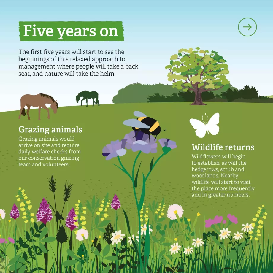 Ultimately, the first five years will start to see the beginnings of this relaxed approach to management where people will take a back seat (except for ensuring animal welfare), and nature will take the helm. Wildflowers will begin to establish, as will the hedgerows, scrub and woodlands. Nearby wildlife will start to visit the place more frequently and in greater numbers.