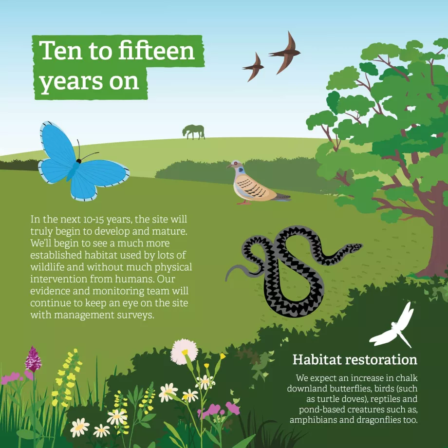 In the next 10-15 years, the site will truly begin to develop and mature. We’ll begin to see a much more established habitat used by lots of wildlife and without much physical intervention from humans. Of course, it would be difficult to predict what species will be there as we let nature take its own course though we expect an increase in chalk downland butterflies, birds (such as turtle doves), reptiles and pond-based creatures such as, amphibians and dragonflies too. Our evidence and monitoring team will continue to keep an eye on the site with management surveys which are a system of surveys we use across key reserves to ensure that the plans for the site are on track and if they’re not, what needs to change in the management plan to adapt and continue to improve biodiversity.
