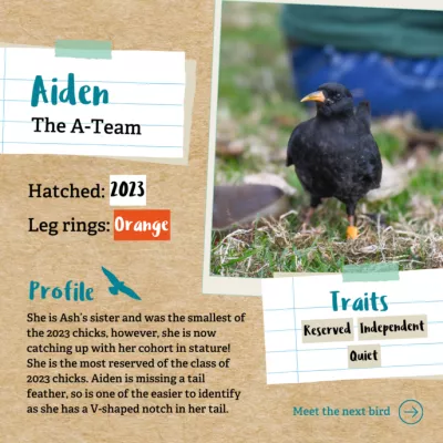 Arwyn hatched at Wildwood Trust, and can be identified by her two yellow leg rings. She is often seen with her brother Aristotle and is described by the “Chough Mums” as a quiet bird (probably because she can’t get a tweet in over Aristotle). She is sometimes drawn into Aristotle’s adventures. Unlike him, she has never been injured but often keeps her unruly brother company when he is on “nest rest.” Staff joke that this is when they become ‘grounded teenagers’.