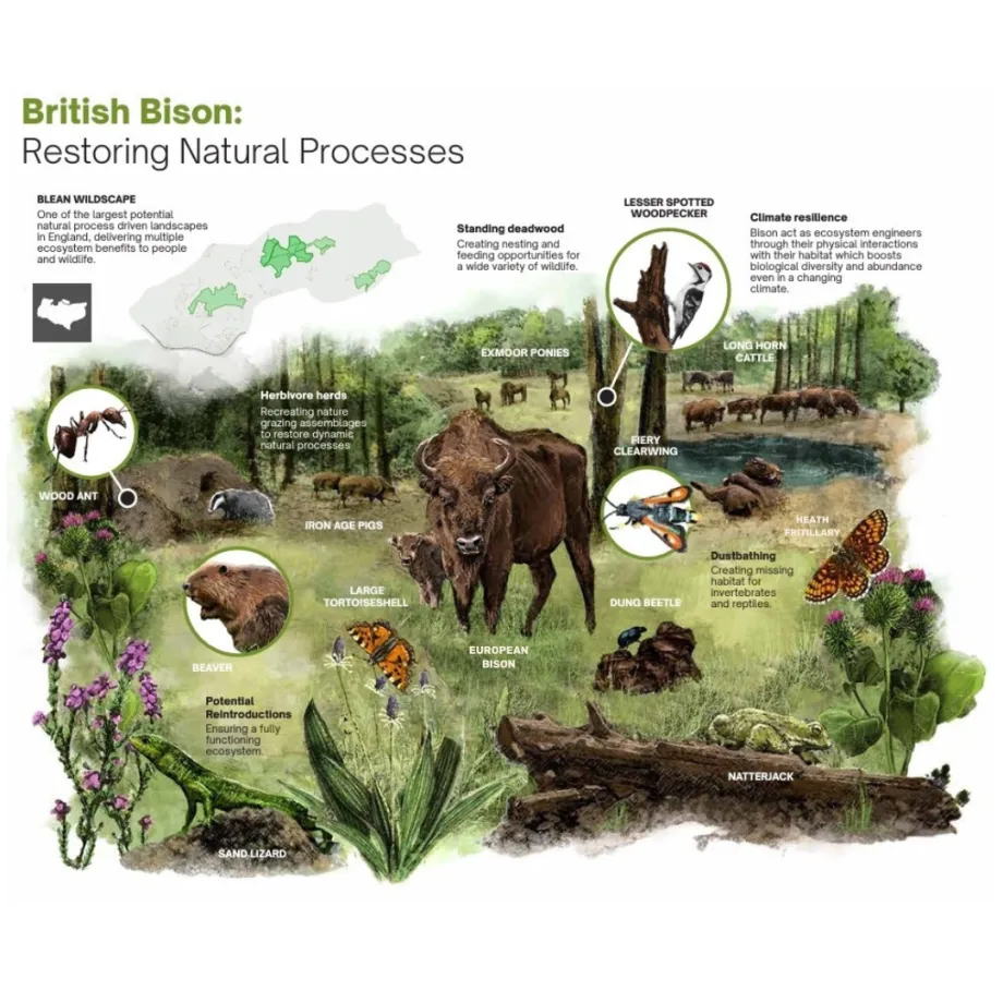 The infographic further discusses climate resilience, explaining how bison, as ecosystem engineers, boost biodiversity and habitat abundance through their physical interactions with the environment. Additionally, it features potential reintroductions such as the beaver, sand lizard, and natterjack toad to help ensure a fully functioning ecosystem.