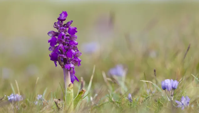 A short, but pretty plant of unimproved grasslands, the Green-winged orchid gets its name from the green veins in the 'hood' of its flowers. Look for it in May and June.