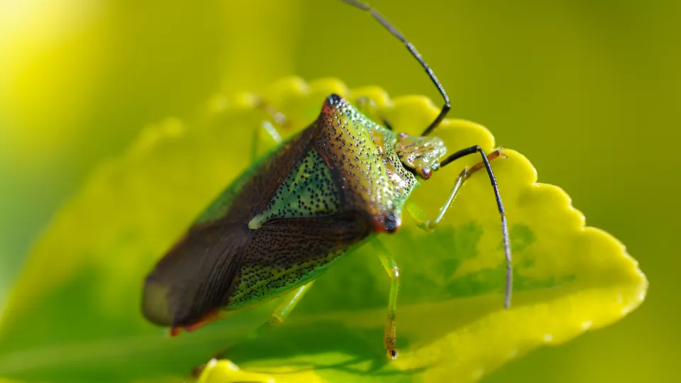 Our largest shieldbug, the red-and-green hawthorn shieldbug can be seen in gardens, parks and woodlands, feeding on hawthorn, rowan and whitebeam. The adults hibernate over winter.