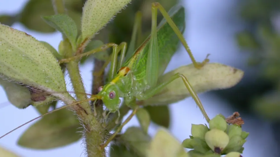 The Speckled bush-cricket, as its name suggests, is covered in tiny, black speckles. It can be found in scrub, hedgerows and gardens throughout summer. Males rub their wings together to create a 'song' for the females.