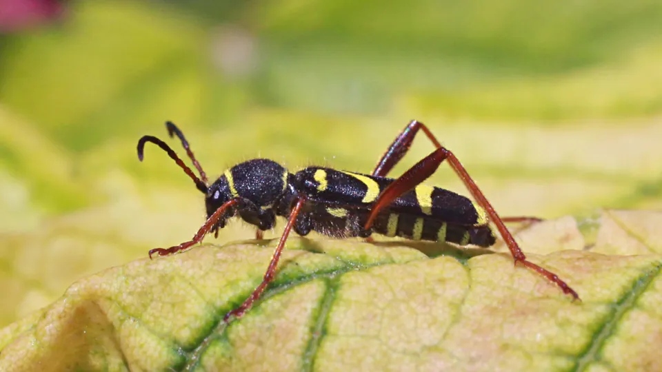 A clever mimic, the wasp beetle is black-and-yellow and moves in a jerky, flight-like fashion - fooling predators into thinking it is actually a more harmful common wasp. Look for it in hedgerows and woods in summer.