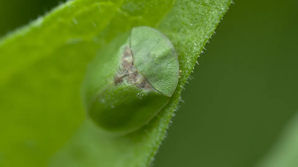 When threatened, the Green tortoise beetle acts just like a tortoise, pulling its feet and antennae in and hunkering down, gripping the leaf it is on as tightly as possible. Look for it on White Dead-nettle in gardens and hedgerows.