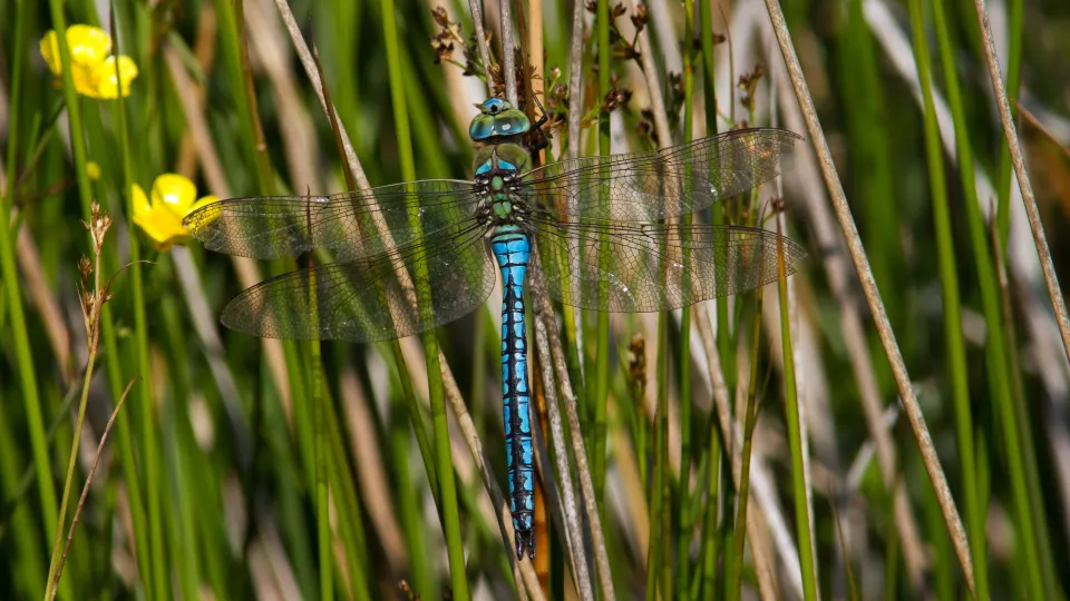 A common dragonfly of ponds, lakes and canals near woodland, the Southern Hawker can be seen patrolling the water or 'hawking' through woodland rides. A fast-flying species, it will catch its prey mid-air.