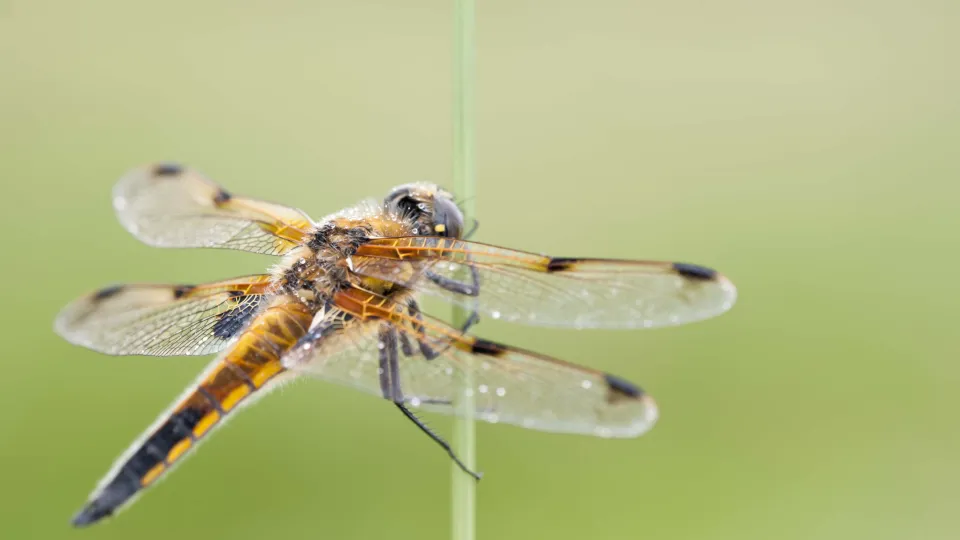 The Four-spotted chaser is easily recognised by the two dark spots on the leading edge of each wing - giving this species its name. It can be seen on heathlands and near ponds and lakes.