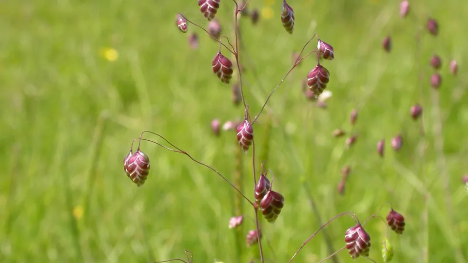 As its name suggests, quaking-grass can be seen quivering or 'quaking' in a breezy, summer wildflower meadow. Its purple-and-green, heart-shaped flower heads hang from delicate stems.