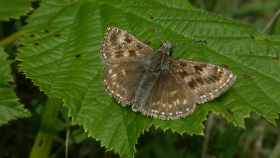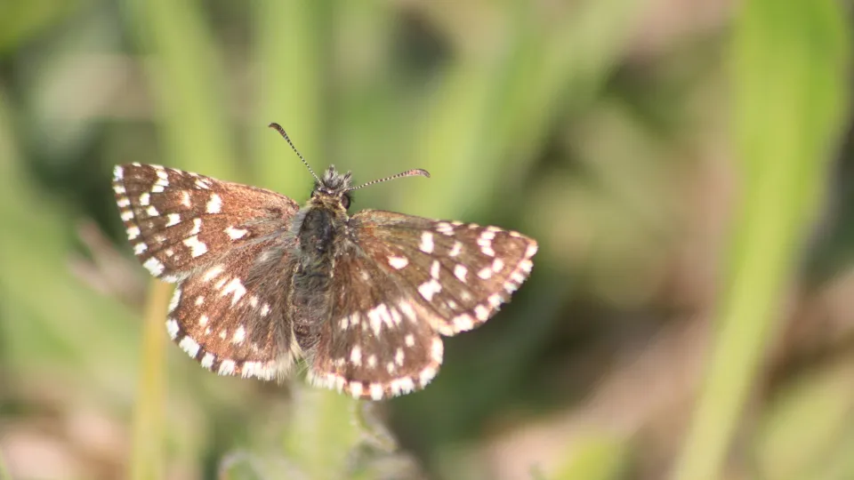 The grizzled skipper has a striking brown-and-white checked wing pattern. It is a fast flier, so is best observed in the morning as it basks in the sun to warm up. It favours chalk grassland and woodland habitats.