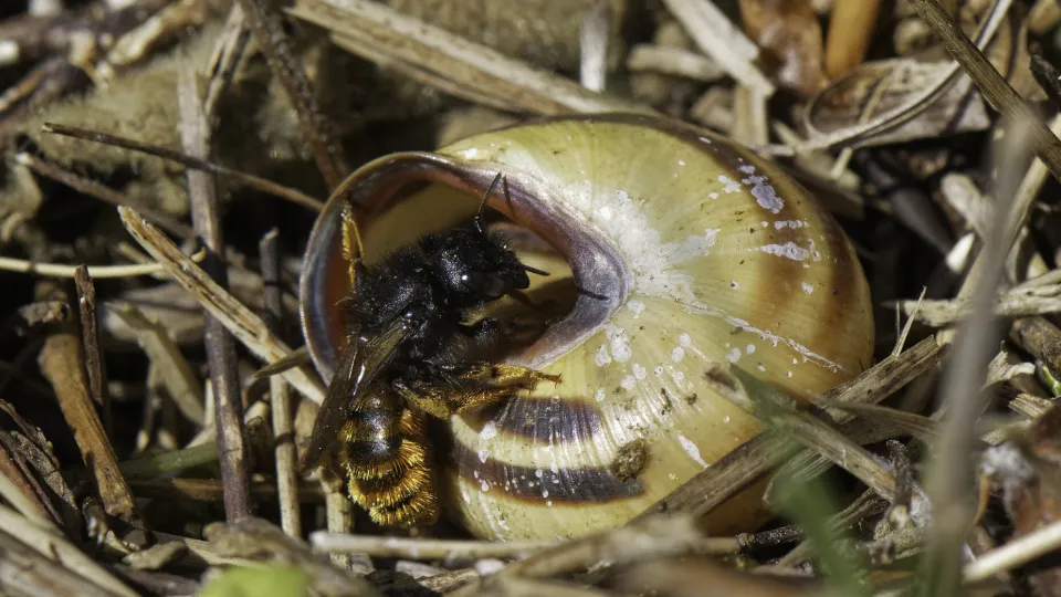 Also known as the two-coloured mason bee, this beautiful bee is famous for nesting in old snail shells.