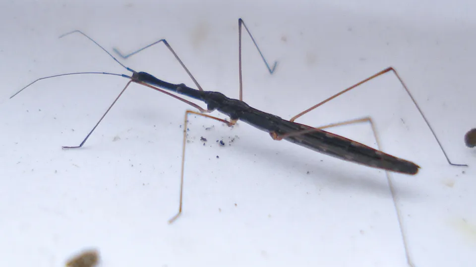 Found in ponds and marshes, the fragile look of the Common water-measurer belies its fierce nature. A predator of small insects, it uses the vibrations of the water's surface to locate its prey.