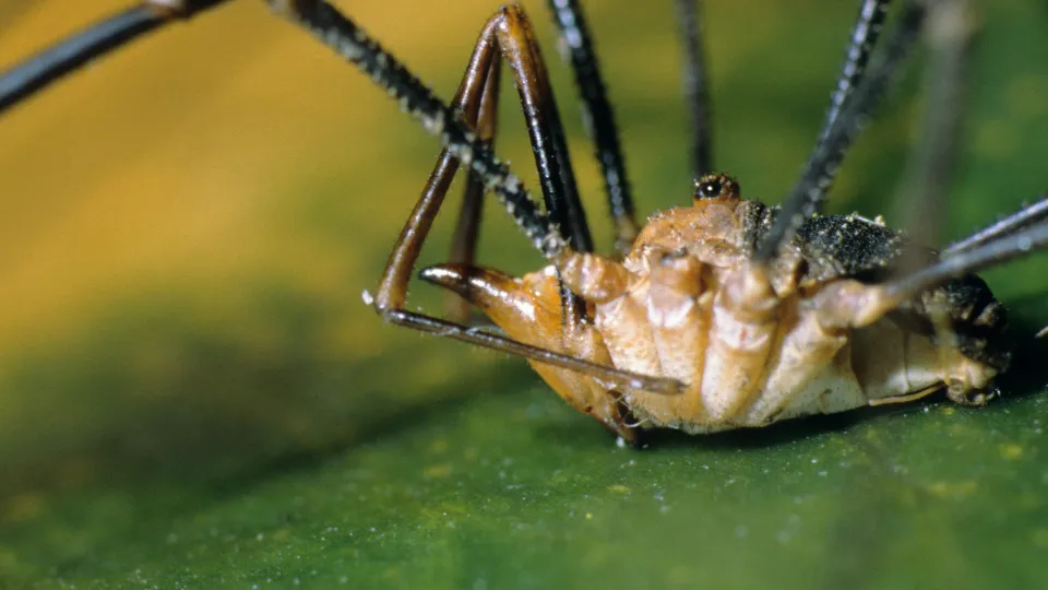 The Common harvestman is familiar to us as the large, spindly spider-like creature that frequents gardens and houses. It predates on smaller invertebrates which it catches using hooks on the ends of its legs.