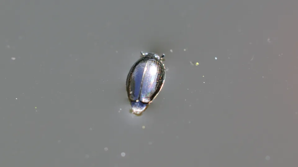 The Great diving beetle is a large and voracious predator of ponds and slow-moving waterways. Blackish-green in colour, it can be spotted coming to the surface to replenish the air supply it stores beneath its wing cases.
