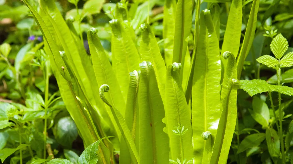 The hart's-tongue fern is a hardy fern of damp, shady places in woodlands. It also makes a good garden fern. It has simple, tongue-shaped, glossy, green leaves that have orange spores on their undersides.