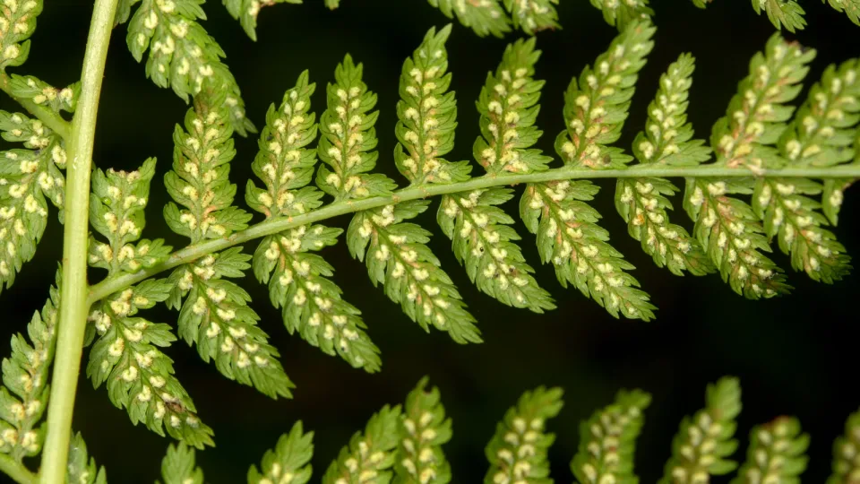 The common polypody is a hardy fern of damp, shady places in woodlands. It also makes a good garden fern. It has ladder-like, leathery foliage with pimply undersides - these spots are the spores.