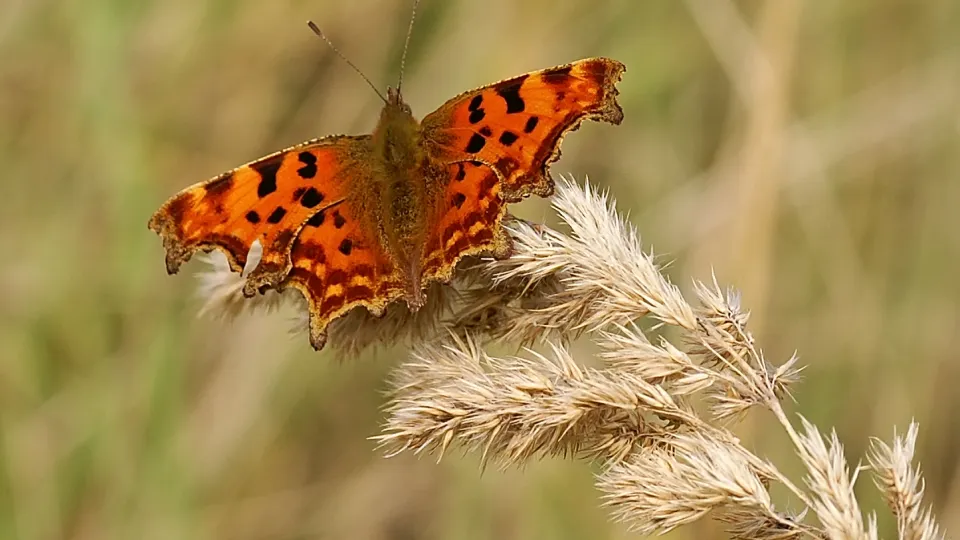 The comma has distinctively ragged wing edges, which help to camouflage it - at rest, it looks just like a dead leaf! It prefers woodland edges, but can be spotted feeding on fallen fruit in gardens.