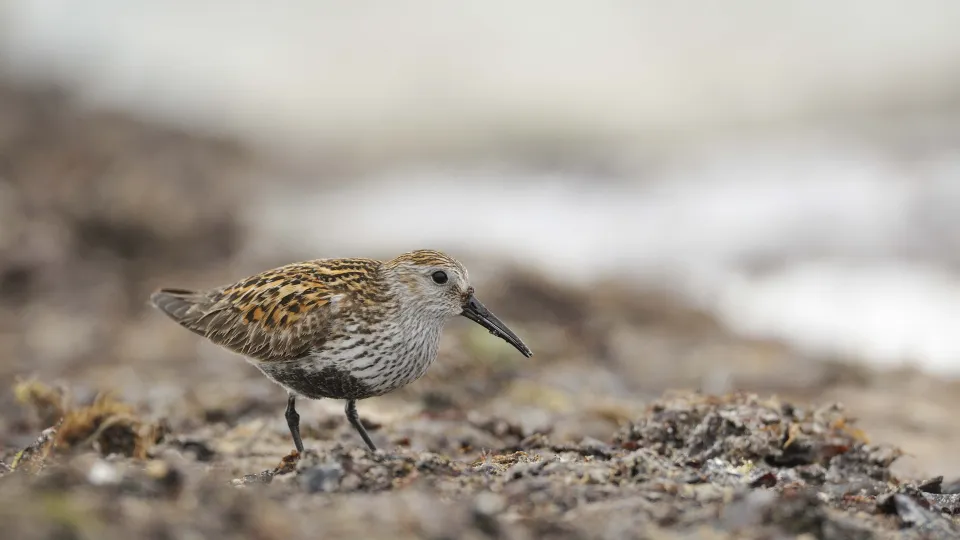 Found along the coast all year-round, the dunlin is a small sandpiper that breeds and winters in the UK. It can be seen in its upland breeding grounds in summer, when it turns brick-red above and sports a black patch on its belly.
