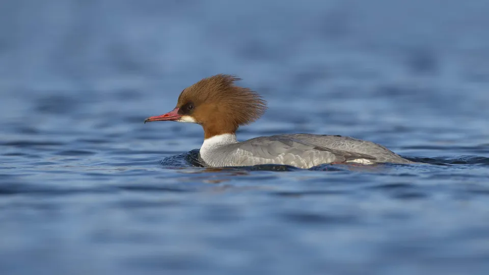 The streamlined goosander is a handsome bird and a great fisher - its long, serrated bill helps it to catch and hold its slippery fish prey. It nests in riverbank trees, but can be seen on lakes and reservoirs in winter.