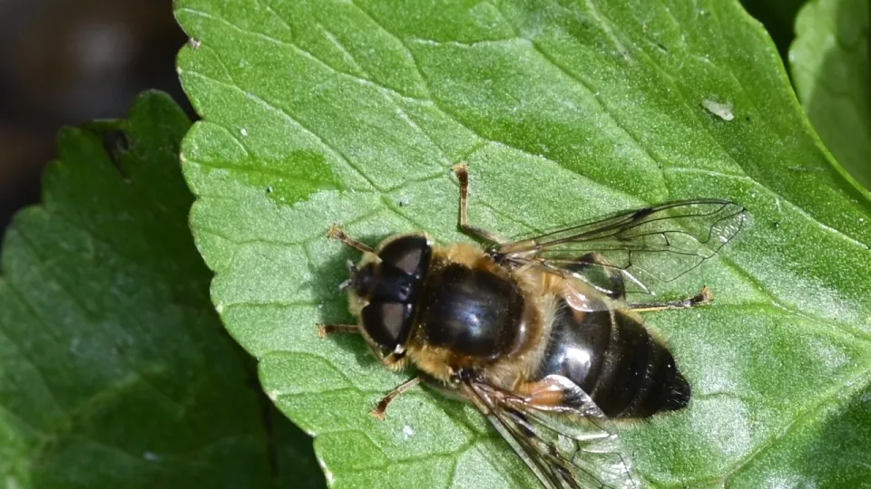 With brown-and-orange markings, the Drone-fly looks like a male Honeybee, but is harmless to us. This mimicry helps to protect it from predators while it searches for nectar in gardens and urban areas.