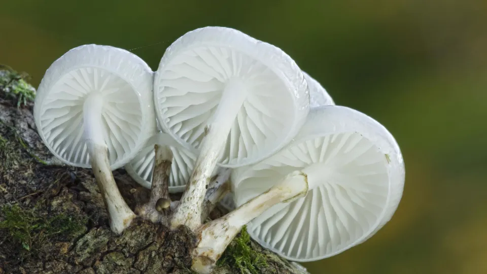 The shiny, translucent porcelain fungus certainly lives up to its name in appearance. It can be seen growing on beech trees and dead wood in summer and autumn.