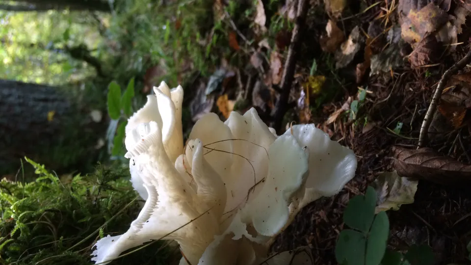 The angel's wings fungus grows in overlapping clusters in the coniferous woods of Scotland and north England. Its funnel-like, white caps have no stems.