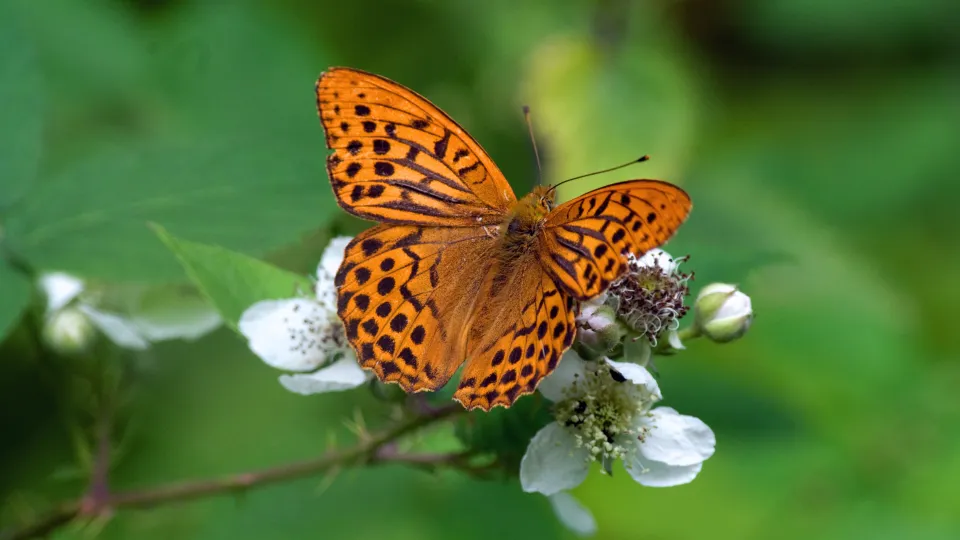 The dark green fritillary is actually an orange butterfly with black spots. It gets its name from the dark green hue to the undersides of its hindwings. A strong flier, it can be seen on open, grassy habitats.