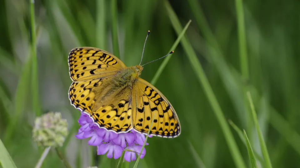 The small pearl-bordered fritillary is a pretty orange-and-brown butterfly of damp grassland, moorland, and open woodland. It gets its name from the row of 'pearls' on the underside of its hindwings.
