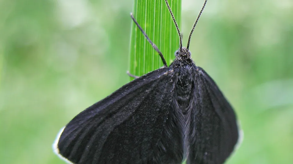 This sooty-black, day-flying moth is active on sunny days, rarely settling in one place for long.