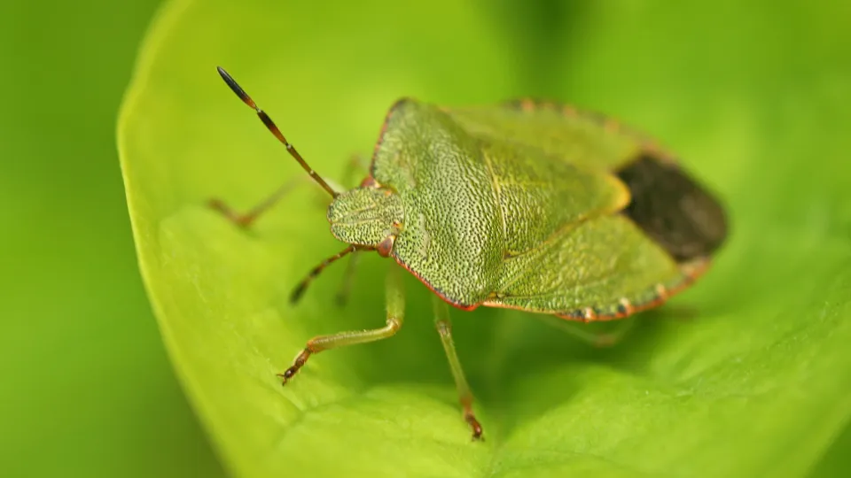 Unlike many of its relatives, this shimmering shieldbug is a predator, feasting on caterpillars and a variety of other insects.