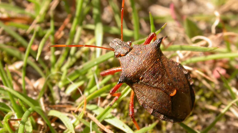 The spiked shieldbug has fearsome shoulder projections or 'spikes' and a predatory nature. This brown bug feeds on caterpillars and other insects in woodlands and on heathlands.