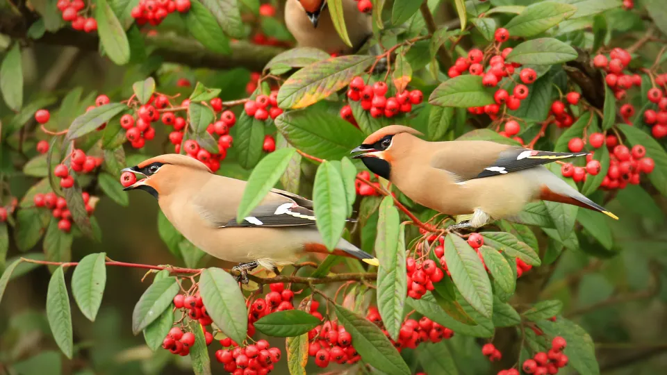 The waxwing is a colourful winter visitor. It can often be spotted in large flocks in berry-laden bushes in towns, car parks and gardens.