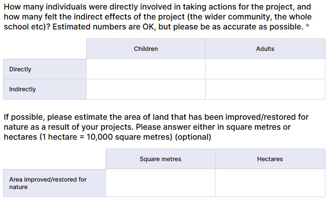 When you are ready to collate your hard work from across the year, download the form as a Word Document and start typing it up. We don’t need lots of detailed paragraphs, just a few concise sentences to let us know how you completed the action, who was involved, and any impact it has had on wildlife, sustainability, and people’s relationships with nature. It is sometimes helpful to note where there are supporting images attached. You can find an example submission form below: