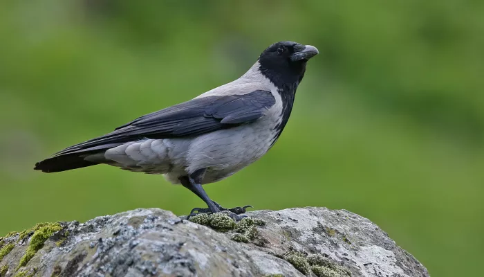 The hooded crow is an unmistakeable crow. It is grey, with a black head, tail and wings.