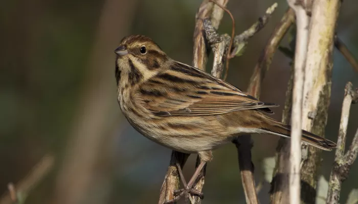 A streaky brown bird, the reed bunting can be found in wetlands, reedbeds and on farmland across the UK. Males sport black heads and a white 'moustache'.