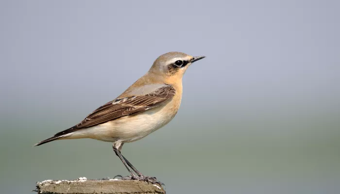 The wheatear has a characteristic tail pattern: a black 'T' on a white rump, which can be seen when it is in flight. Males are smart-looking birds, with blue-grey backs and heads, black wings, black cheeks with white eyestripes, and pale orange chests. Females are browner and juveniles speckled.