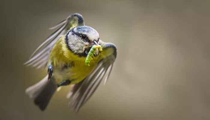Smaller than the great tit, the blue tit is also a bird of woodland, parks and gardens. It nests in holes in trees, but is just as happy to use nestboxes. Blue tits are active feeders, hunting out insects and spiders among the smaller branches and leaves of trees in woodlands. But they are also well-adapted to gardens and towns and will visit birdtables and peanut feeders; they are even famed for breaking the tops of milk bottles and taking the creamy top off the milk. In winter, they will form flocks with other tits, roaming the countryside and visiting gardens in groups. Blue tits have a trilling, 'tsee-tsee-tsee' song.