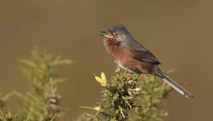 The Dartford warbler is a small, dark brown bird, with a long tail, a distinctive red eye-ring and a cherry-red breast. It is most often spotted warbling its rattly and scratchy song from the top of a gorse stem. At other times, its muted tones allows it to blend in with the woody heather and gorse.