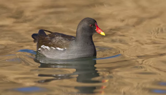 A familiar black bird of our lakes, ponds and rivers, the moorhen is widespread; look out for its large and untidy-looking nest on the water in spring. It can be distinguished from the similar coot by its yellow legs, red beak and the white patches on its body.