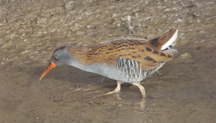 A small relative of the moorhen and coot and about the same size as a redshank, the water rail lives in reedbeds and freshwater wetlands where it feeds on invertebrates and small fish. Secretive and rarely seen, Water rails are more often heard calling; making a sound like a piglet squealing, they are unmistakeable. Around 1,100 pairs nest in in the UK.