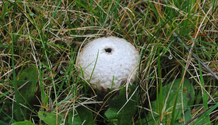 The common puffball grows on the ground in woodlands and grasslands, often occurring in small clusters. When a fruiting body is mature, a hole opens at the top. When the puffball is bumped by a passing animal or even hit by raindrops, a cloud of spores is puffed out of the hole. The spores will drift away on the wind and help the fungus spread.