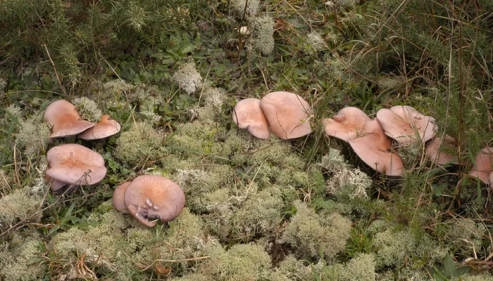 The wood blewit is an attractive, lilac fungus that grows in broadleaved and coniferous woodland, and parkland. It is common in autumn and winter. It is edible, but is similar in appearance to the Bruising Webcap, which is not; indeed, never pick and eat fungi that can you cannot positively identify. Fungi belong to their own kingdom and get their nutrients and energy from organic matter, rather than photosynthesis like plants. It is often just the fruiting bodies, or 'mushrooms', that are visible to us, arising from an unseen network of tiny filaments called 'hyphae'. These fruiting bodies produce spores for reproduction, although fungi can also reproduce asexually by fragmentation.
