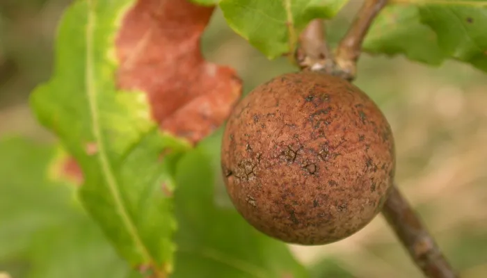 The oak marble gall wasp produces brown, marble-shaped growths, or 'galls', on oak twigs. Inside the gall, the larvae of the wasp feed on the host tissues, but cause little damage.