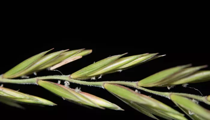 Common couch has green, fat, blade-like leaves, but long, thin flower spikes. Tiny, golden spikelets appear at the ends of the stems in rows.