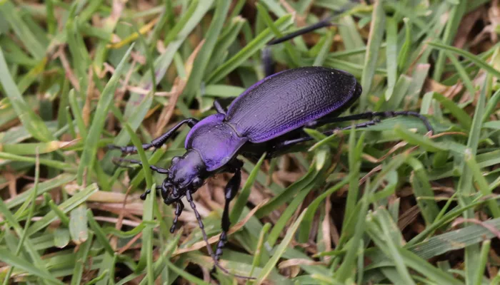 There are two very similar species of violet ground beetle. Carabus violaceus is the more common of the two beetles, found in gardens and meadows, and on farmland. Carabus problematicus is slightly less common, favouring woodland and heathland, though it can sometimes be found in gardens.