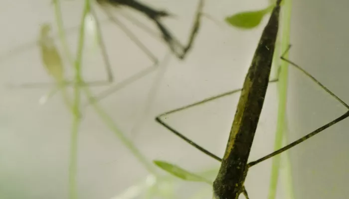 During hot summer days, adult water stick insects often leave the pond to hunt in emergent vegetation, or may fly to a new pond.