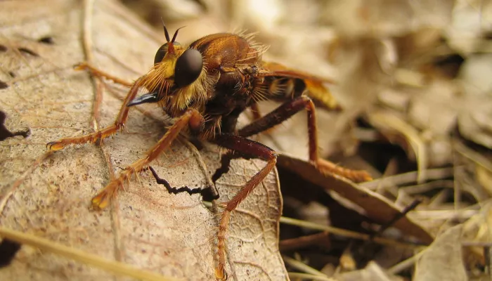 With black-and-yellow markings, the Hornet robberfly looks like its namesake, but is harmless to us. This mimicry helps to protect it from predators while it perches in the open, waiting for its own prey.